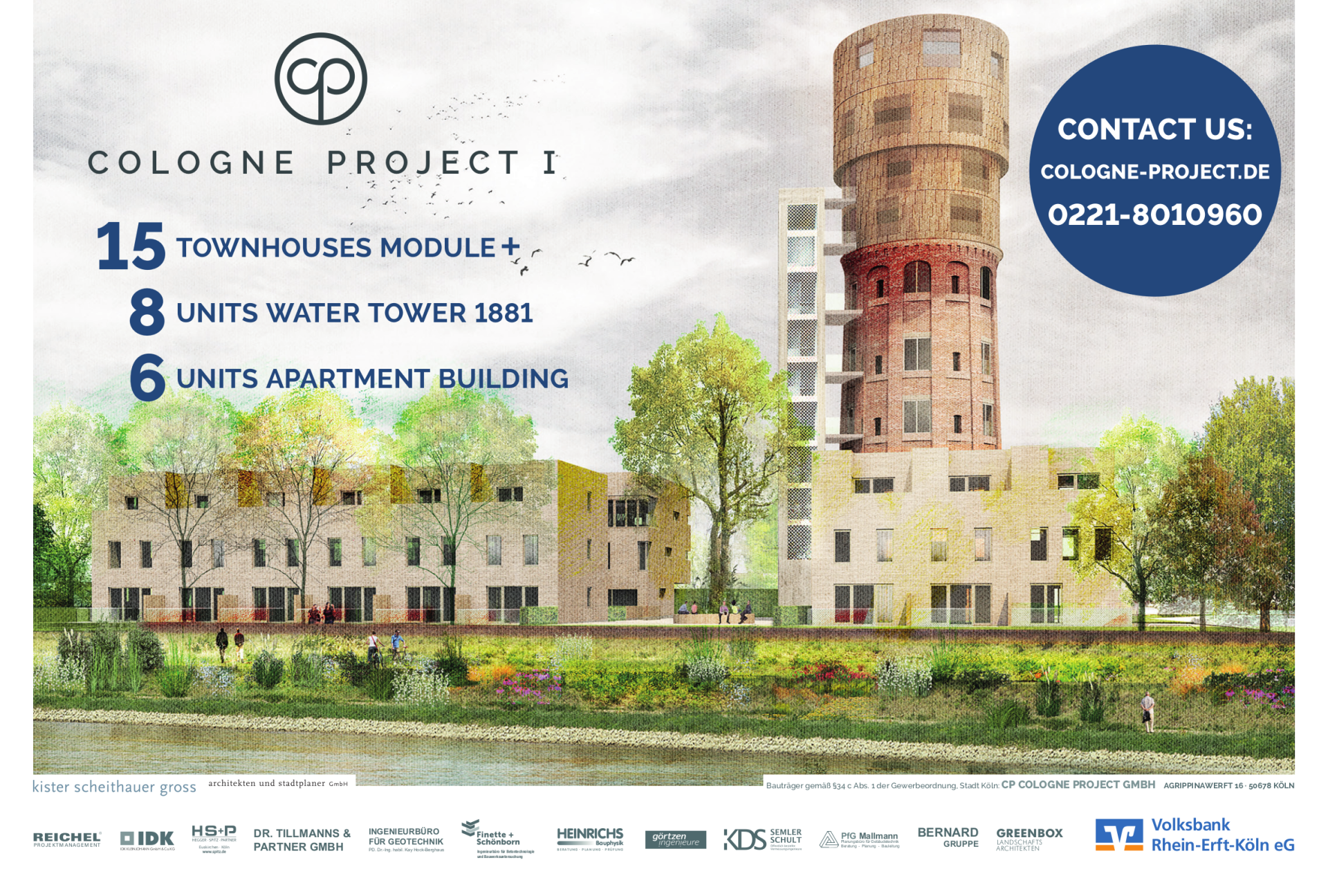 "Cologne Project I" is a closed area (safe community) with a historic water tower (monument from 1881) in the direct vicinity of Cologne-Stammheim on the Rhine. The concept provides for sophisticated living for all generations in a safe living space.